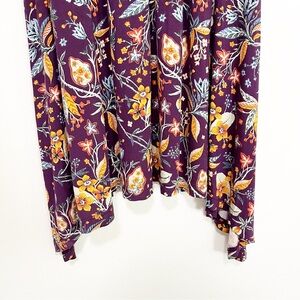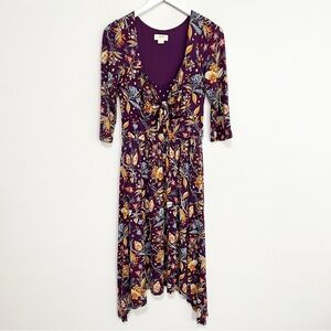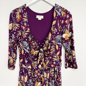 Anthropologie Maeve Beloved midi jersey dress in a dark plum fall floral combo, rayon/spandex blend, partially lined, tie front detail, shark-bite hem fit & flare. Great pre-owned condition. Offers welcome!