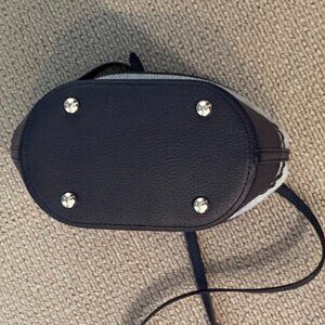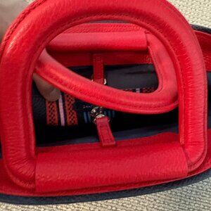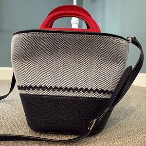 Like-new bucket bag, crafted from 100% cotton herringbone and trimmed with colorful top grain leather, for a classic, goes-with-everything look. It has a removable cross-body strap for extra versatility. Plus, it's big enough to stash all of your essentials... and anything you might pick up along the way!