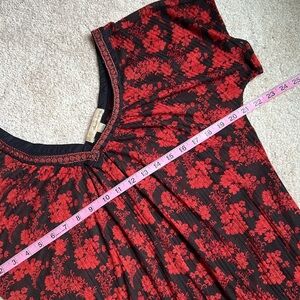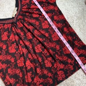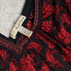 Lightweight short sleeve top with elastic waist and embroidered double v-neck. VGUC.