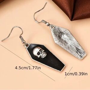 As pictured, you’ll see dangly earrings in the shape of a coffin with a skull on top. They are sterling silver and lightweight. Dimensions are in the photo.