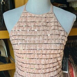 NOTE: there are sequins missing in the front of the dress. You could wear as is, try to replace or take some from another part of the dress and put in that spot. Priced accordingly.