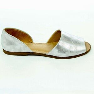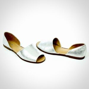 Very cute peep toe flats that work well with shorts, jeans or a maxi skirt. Silver distressed metallic upper.