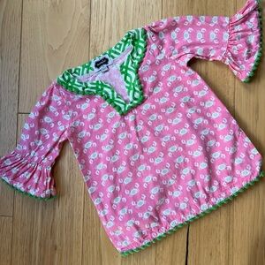 We used this for a swimsuit cover-up one time on vacation. It is really cute on. In good condition. No tips or stains. Very sweet. Size tag says 24/2t