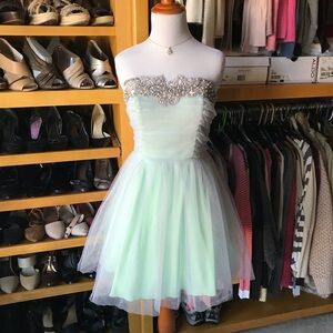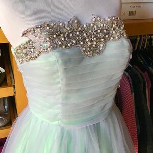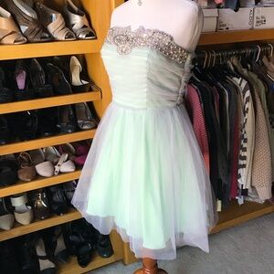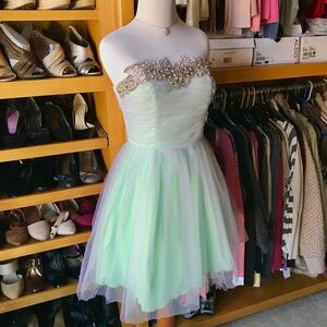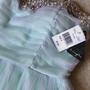 Really pretty mint green dress with lilac overlay. The two colors together are really unique! Size 9 fitted-zipper. Will probably need to be steamed.