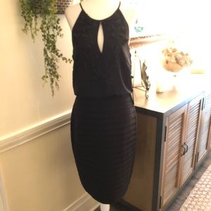 Beautiful black matte jersey blouson banded sheath dress with halter neckline!