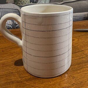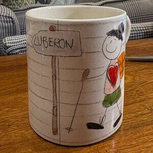 Charming handmade mug made by French pottery brand Marchand de Couleurs. On the larger side (see dimensions). This "Scribbles"pattern (an imitation of children's drawings) called "The Hiker" features a happy girl hiking and the word "Luberon" for the pre-Alps Mountain range in Provence, France. Though there are other "hiker" mugs, this pattern is discontinued.