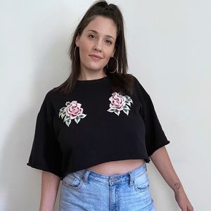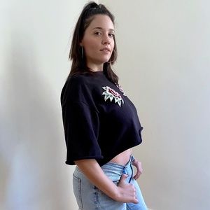 Cutoff sweatshirt top with beautiful embroidered roses. 3/4 sleeve., loose fitting. Model is a size Large. No flaws, perfect condition!