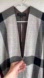 Stylish poncho with a gray and black plaid pattern. Features a loose, flowing design. Cotton blend, zipper front. See photos for armholes. NOTE - stock photo is the same sweater in a different plaid pattern - included here to show style and fit.