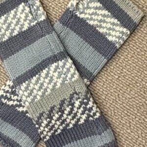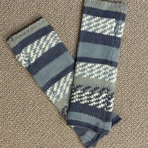 Handmade arm warmers with thumb holes in knitted gray and blue-gray yarn. About a foot long each. In like-new condition.