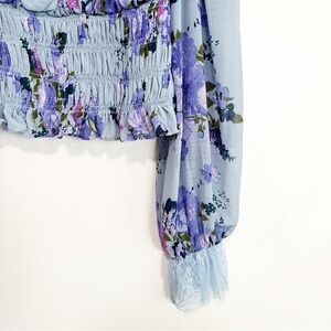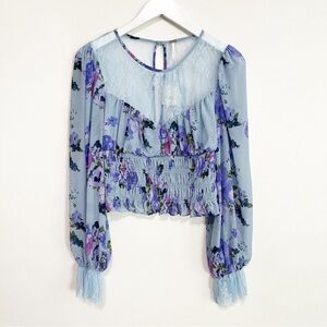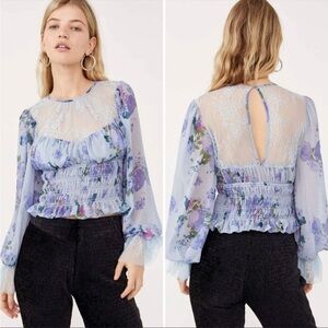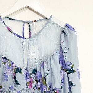 Free People Daphne blouse in Silver Blue Floral combo, lightweight polyester chiffon with lace trim, keyhole button back, smocked waistline, puff sleeves, dresses up or down. In NWT condition. Offers welcome!