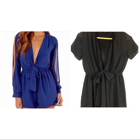 BOGO Tobi Rompers. Black short sleeve romper with deep v cut and tie in front w sheer material. Royal blue long open-sleeve romper with deep v cut and tie in the front w sheer material. So cute for many occasions! Never worn!