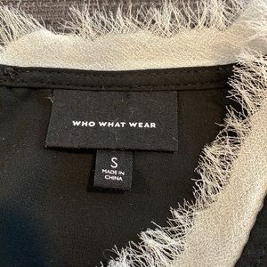 Black professional blouse with white feathery trim. In great condition, size small. Would look great paired with slim dress pants or jeans.