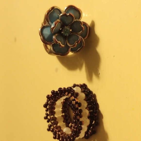 one beaded vintage ring sz ,7. copper, brown and white in color. one Blue flower adjustable vintage costume ring. Band has slightly turned. very pretty rings. thank you for looking,!