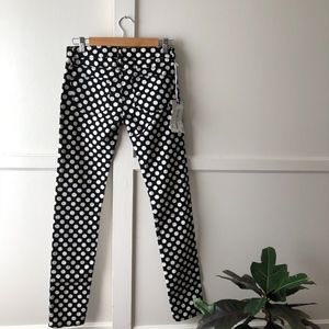 Super quirky 97% cotton and 3% spandex polka dot skinny jeans. They have just the right amount of stretch, a zip fly with button closure, 5 pocket construction. Definitely a statement piece.Approx inseam: 29", Rise 10'