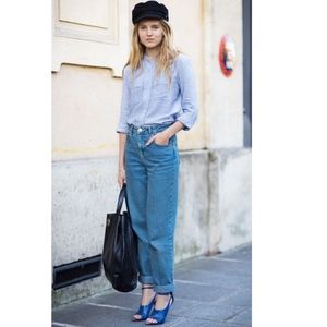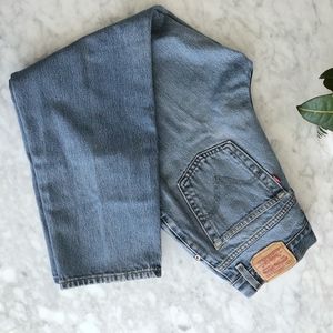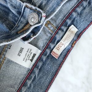 Levi's 550, in a light/medium wash with a red tab. They feature a zipper and button fly, classic 5 pocket design, relaxed fit, and tapered leg. Great classic to have in your closet. States they are 12S but as most vintage they run small, approx. measurements are: waist- 14.5", hips- 21", rise 14" inseam-27" (street style image for style inspiration)