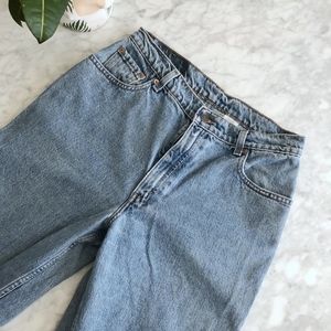 Vintage Levis 550, in a light/medium wash with a red tab. They feature a zipper and button fly, classic 5 pocket design, relaxed fit, and tapered leg. Great classic to have in your closet. States they are 12R but as most vintage they run small, approx. measurements are: waist- 15", hips- 21", rise 14" inseam-27.5" (street style image for style inspiration)