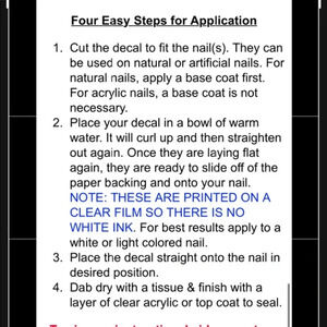 📌:➡️THESE ARE PRINTED ON A CLEAR FILM SO THERE IS NO WHITE INK. For best results apply to a white or light colored nail.