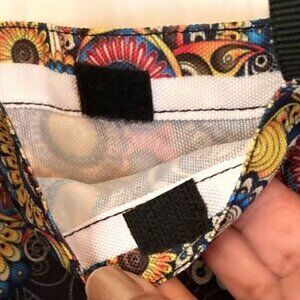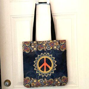 This vibrant tote bag features a striking peace sign design with a mix of blue, orange, and yellow colors.