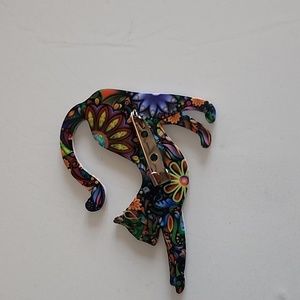 Add a splash of color to your wardrobe with this charming Bohemian bright color patterned acrylic cat brooch.