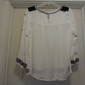 BOHEMIAN DREAMER CREPEY RAYON EMBROIDERY PEASANT BLOUSE BY KNOX ROSE M. THIS IS A WONDERFULLY MADE AND STYLED BOHO BLOUSE. IT WAS MADE IN CHINA. IT IS 100 % RAYON W POLYESTER EMBROIDERY AND LACE ON SHOULDERS. IT HAS A SEMI GAUZEY TYPE OF LIGHT PLEATS AS TEXTURES. FROM UNDERARM TO UNDERARM ALL THE WAY AROUND THE ITEM IS 44 INCHES. WITH SOME WEAR YET PLENTY TO SHARE WITH YOU LUCKY BUYER. ENJOY THE BOHO GIRL LOOKS. 5TH GROUP. #225. THANKS