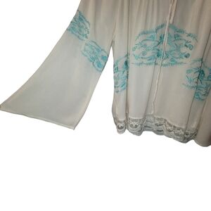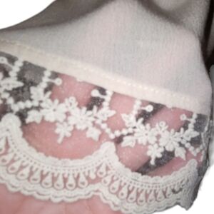 Its cream-colored fabric is intricately embroidered along the bodice, featuring a drawstring and elastic neckline for a flirty look. The lace sheer hemline prompts a romantic vibe.