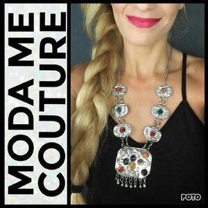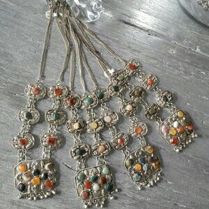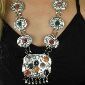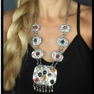 Goregous Boho necklace. Each necklace is unique & hand crafted in India. Multi color gems, agates and stones on silver toned metal with naturally accuring patina. If you love bohemian vibes this necklace is a most have!