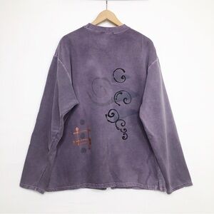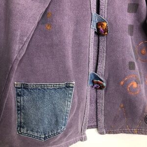 Bohemian custom purple embellished button down sweatshirt, with painted embellished buttons and a denim front pocket with paint design on the front and back very unique very retro with a cotton blend no size or fabric tag but very good condition please refer to measurements,