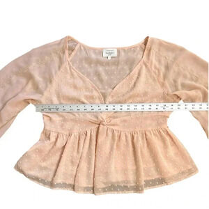 BOHME Peach Swiss Dot Chiffon Top sz L Peplum Waist Deep V-Neck Long Sleeve Boho