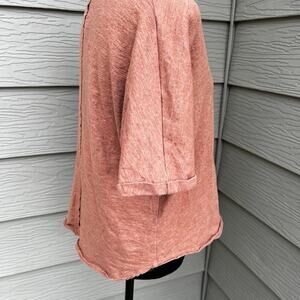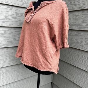 Women’s size S, short sleeve, 1/4 button, cuff, short sleeve t-shirt. Rusty/brown color. *see photo-small hole left side front.