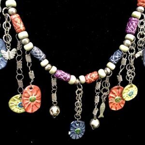THIS IS AN AMAZING AND SUPER LONG HAND MADE ARTISAN NECKLACE, IT HAS MULTIPLE BEADS WITH A QUILTED FINISH MIXED WITH GREY AND SILVER PONY BEADS..AT THE FRONT BOTTOM OF THE NECKLACE ARE 12 DANGLES HANGING FORM ROUND LINK ROPE CHAIN LINKS, THERE ARE FLOWERS IN CERAMIC AND VARIOUS FISH, BEADS AND BUTTERFLY ETC..THE COLORS ARE MUTED BLUES, PURPLE, EARTH TONES, YELLOW AND GREY..