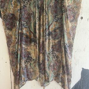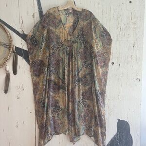 BOHO AUSTRALIA Dreamy Floral Sheer Maxi Kaftan its billowy and breezy. A beauty of a dream floral garden , vibrate and eye-catching, this is truly a special piece that was purchased in Cala Jondal in Ibiza, Spain 15 years ago. Its fit is super relaxed and oversized I even wore this during my pregnancy and after. Pair with a tank top, jeans and strappy sandals or beach cover up with slide on’s. Vintage inspired 1970’s, sheer, relaxed sleeves and pull on style.