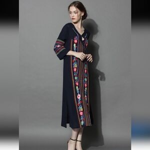 BOHO BLOSSOM MAXI CREPE DRESS IN NAVY with EMBROIDERY