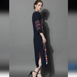 Constructed out of delicate floral embroidered gayzy crepe fabric with a tassel-trimmed deep V-neckline, this stunning maxi dress will give your autumn wardrobe a stylish dose of Boho Chic!