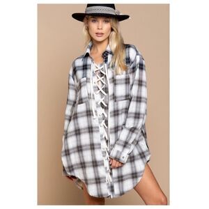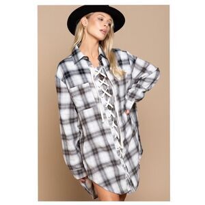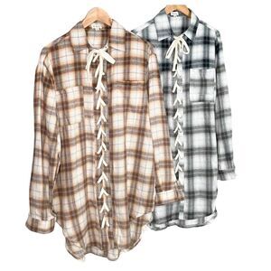 A fun front lace-up strappy shirt featuring plaid fabrication throughout the garment, Designed in a relaxed fit with long sleeve for feminine look and finished with slit on the side of the body hem