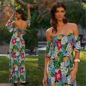 Multi colored Floral Print Off-The-Shoulder Puff Sleeve Smock Lace-Up Detail Summer Maxi Dress