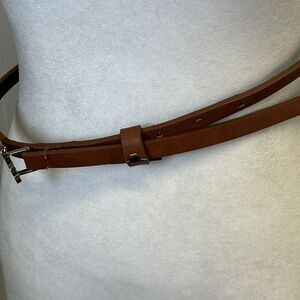 This is a boho-style faux leather skinny belt designed for women. It features a colorful enamel flower buckle, adding a unique and stylish touch to any outfit. The belt is adjustable and comes in a brown color, with a skinny width that can easily be paired with various clothing items. Made of faux leather, this belt is adorned with a buckle for added flair. Please refer to the provided photo for how the belt looks when worn. SEE LAST PHOTO FOR WEAR ON THE UNDERSIDE OF BELT. PRICED ACCORDINGLY