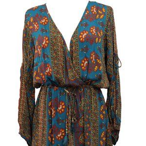 Boho inspired print V-neck, long sleeve with tassel detail and waist tie mini dress