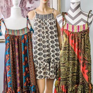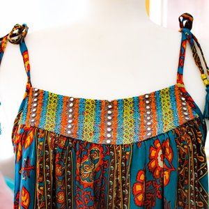 Bohemian print, shoulder tie spaghetti strap with mirror detail midi dress