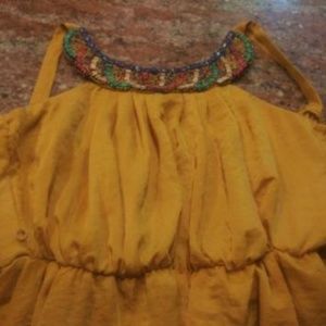 RUBY ROT Junior SZ 9 mustard /gold sleeveless dress with exquisite indian beaded neck line. for evening or casual. quite BOHO