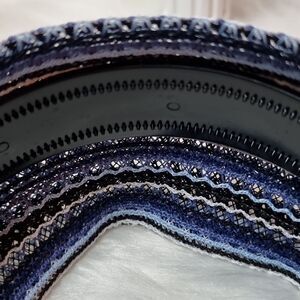 Materials Heavy duty flexible plastic interior with grips covered with knit crochet style cloth in blues, white and black.