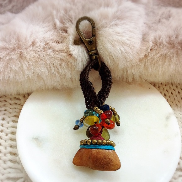 BOHO Vintage Gypsy Hippie Tribal Ethnic Multicolor (green, Blue, yellow, red, gold, orange, brown) Plastic Brass Beads with wood plant seed Keychain
