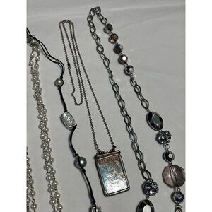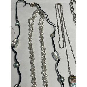 • Multiple necklace designs, including layered pearls and black cord styles with decorative beads