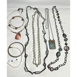 This curated jewelry collection includes an assortment of necklaces, bracelets, and earrings, blending pearls, beads, and decorative charms for versatile styling.