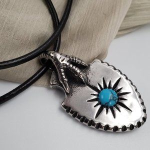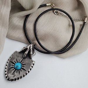 FP Turquoise Necklace Silver/Turquoise/ Genuine Leather cord. Spell/Pow/Star Pendant 2.75' long. Hypoallergenic, water-resistant, and never tarnished.