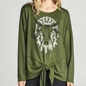 SO Comfortable, this Long sleeve scoop neck bull print tie waist top is easy to pair with jeans and booties