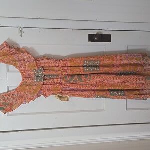 BOHO Orange PAISLEY ON OR OFF SHOULDER HI LO FUN Cinqo De Mayo LARGE DRESS. Elastic waist, string bow at waist flirty flow skirt Resort Family Date night graduation Easter Sunday. This in Ver6 Good condition dress will get pretty second look and compliments!! Fast shipping!!