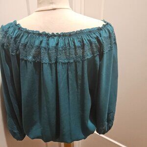 Wear this turquois beautiful blouse on or off the shoulders. The very top of the blouse and the edges of the 3/4 sleeves have lace detailing. There is elastic around the edge of the sleeve bottoms and also around the waist before a ruffle drops. This is a loose and flowy top, but here are some measurements: underarm to underarm 24", length of the sleeves shoulder to bottom 18", the length from shoulder to waist 23", length of shoulder to bottom 26".
