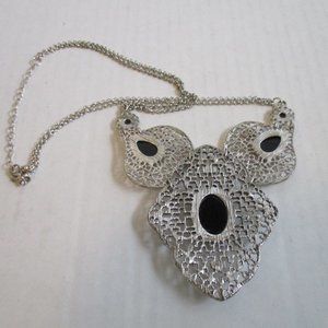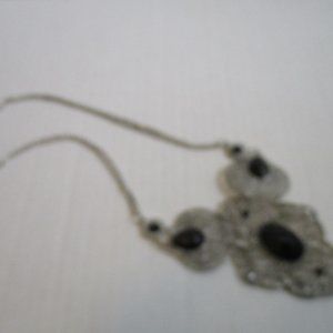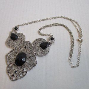 BOHO Silver Filigree and Black Tear Drop Faceted Faux Gems Necklace. Beautiful interlocking sections of delicate beading create a bib pendant. Overall dimensions - 3-3/4"W x 3-1/2"H. 16" double chain. All measurements are approximate. Please see photos for more details. 0601S