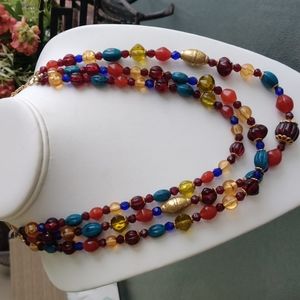 3 strands of lucite beads in a wonderful assortment of shapes and rich colors. Gold bead caps and fittings. Can be worn from 14" to 20". Excellent condition.