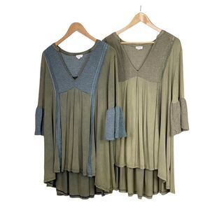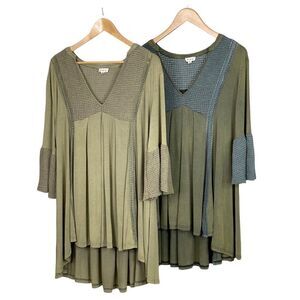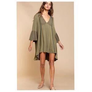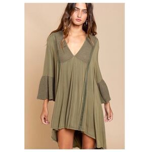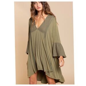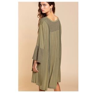 Designed in V neckline tunic dress, 3/4 sleeve with bell shape, oversized fit, trim detailing throughout the body, mixtures of thermal fabrication. featured in Pol's special knit and thermal